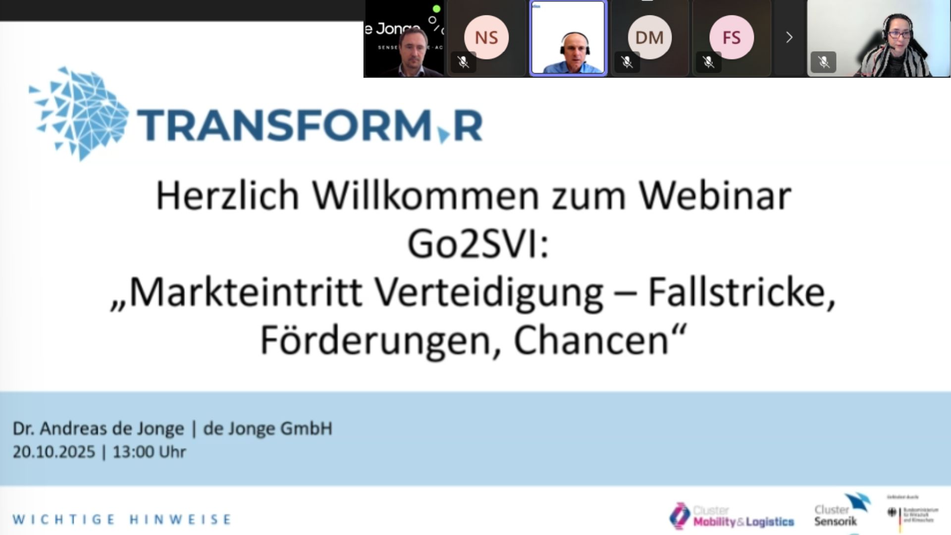 The first part of our new Go2SVI webinar series on October 20, 2025, focused on the entry of medium-sized companies into the defense market. This market is becoming increasingly important, not least due to geopolitical changes, new security strategies, and government support programs. At the same time, it differs significantly from the civilian environment in terms of its regulations, procurement mechanisms, and security requirements.