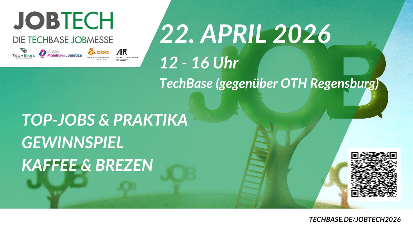 Die JOBTECH ist die ideale Plattform, um Studierende und zukünftige Absolvent:innen mit Unternehmen aus der Region zusammenzubringen. Die JOBTECH wird organisiert vom Cluster Mobility & Logistics in Zusammenarbeit mit der TechBase Regensburg, der Digitalen Gründerinitiative Oberpfalz sowie AIR Artificial Intelligence Regensburg.