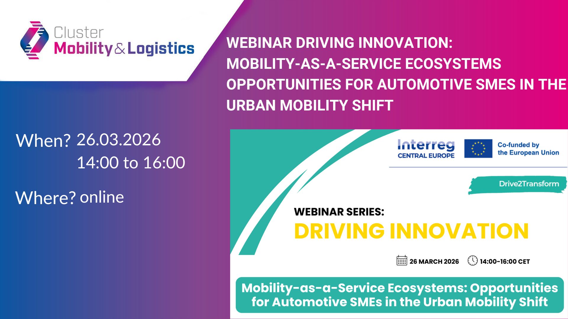 DRIVING INNOVATION is a webinar series within the Interreg Central Europe project Drive2Transform (CE0200679), connecting key mobility innovation regions across Central Europe. The series explores how electrification, autonomous driving, connected vehicles and the platform economy are transforming the automotive industry — and what this means for SMEs, regions and policymakers.