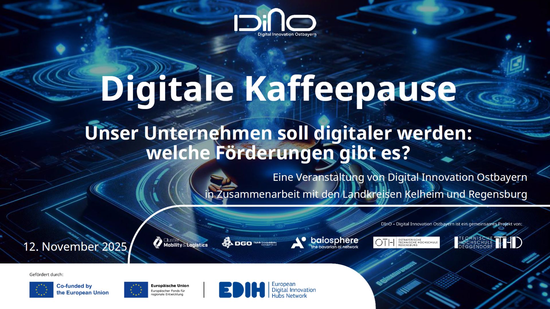 Die Veranstaltung ist Teil des Projektes Digital Innovation Ostbayern (DInO), das eines von drei European Digital Innovation Hubs (EDIH) in Bayern ist. Der Projektfokus liegt auf der digitalen Transformation bei KMU und öffentlichen Verwaltungen. Im Rahmen von DInO unterstützt das Cluster Mobility & Logistics bei den Services "Innovation Ecosystem & Networking" und "Support to Find Financing and Investment".