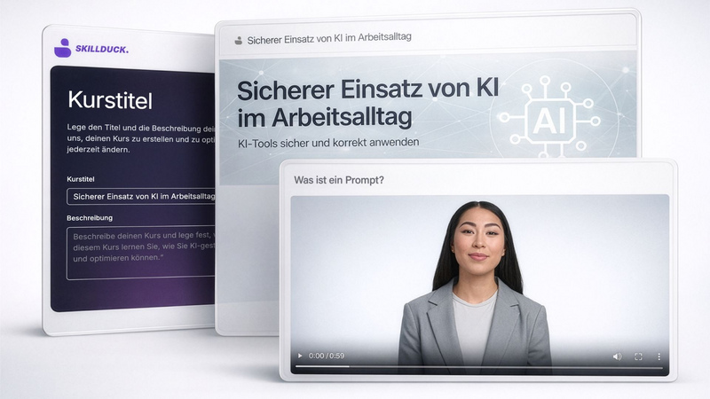 Die Erstellung hochwertiger Web-based Trainings (WBT) ist für viele Learning-&-Development-Abteilungen nach wie vor zeitaufwendig. SkillDuck setzt genau hier an: Der KI-basierte Kursgenerator ermöglicht es Unternehmen, innerhalb weniger Minuten aus einer ersten Themenidee vollständige eLearning-Kurse zu erstellen – inklusive Lernstruktur, Inhalten, Interaktionen, Quizfragen sowie visuellen Elementen.