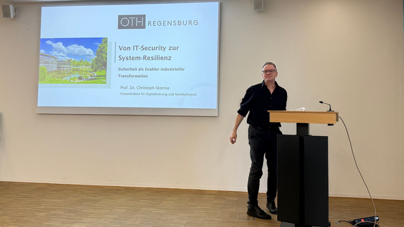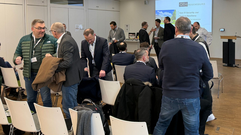Die Veranstaltung begann mit einem informellen Networking bei Kaffee, das den Teilnehmenden erste Möglichkeiten zur Vernetzung bot. Im Anschluss begrüßte Uwe Pfeil von der TechBase Regensburg GmbH die Anwesenden und ordnete das Thema strategisch in die Entwicklung des Standorts Regensburg ein. In seinem Impulsvortrag „Von IT-Security zu System-Resilience – Sicherheit als Enabler industrieller Transformation“ zeigte Prof. Dr. Skornia von der OTH Regensburg eindrucksvoll auf, wie sich Sicherheitsanforderungen in einer zunehmend vernetzten industriellen Umgebung verändern und welche Rolle Resilienz dabei spielt.