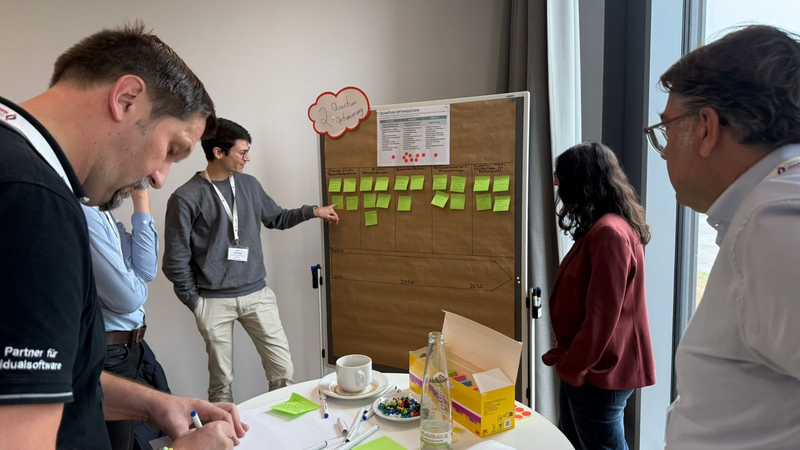 Der interaktive Workshop im World-Café-Format bildete das Herzstück des Vormittags: In drei Gruppen diskutierten die Teilnehmenden zu den Themen Quantum Security, Quantum Optimization und Quantum Industry Readiness. Moderiert wurde der Workshop von der OTH Regensburg (Lukas Schmidbauer), der OptWare GmbH (Dr. Vanessa Junk) und dem Cluster Mobility & Logistics (Steve Schumann). Dabei entstanden zahlreiche Ideen sowie ein gemeinsamer Blick auf Chancen, Herausforderungen und Anwendungsfelder von Quantencomputing – mit starkem Bezug zur Wirtschaft.